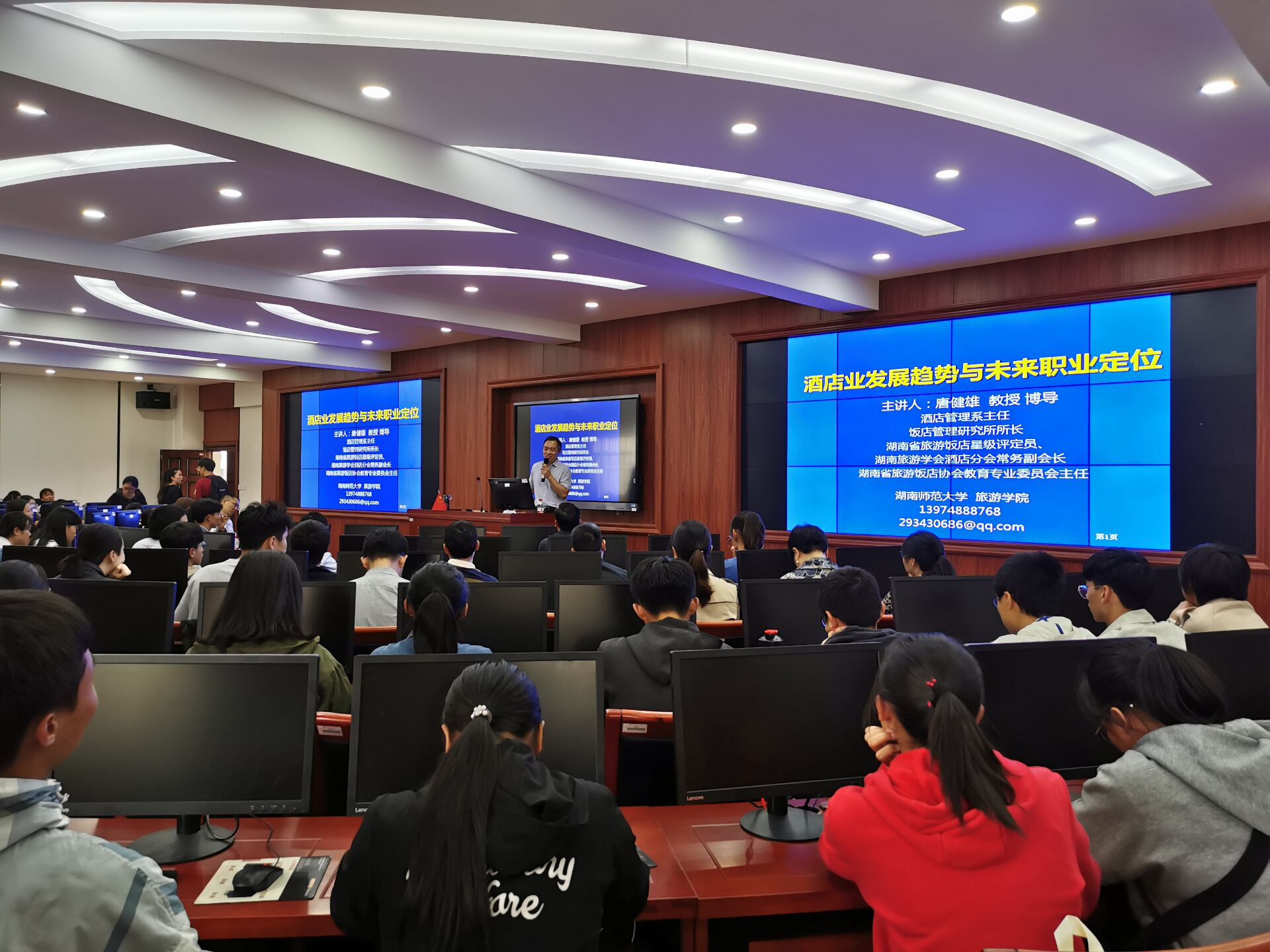 10月22日下午,365best体育官网登录邀请到了湖南师范大学的唐健雄教授做了“酒店发展趋势与未来职业定位”的专题讲座,公司党总支书记王淑霞、副书记刘敬龙,旅游管理教研室主任、硕士生导师刘飞龙及旅游管理教研室的其他老师们到场,与全体2018级旅游管理专业的同学共同聆听本次讲座。