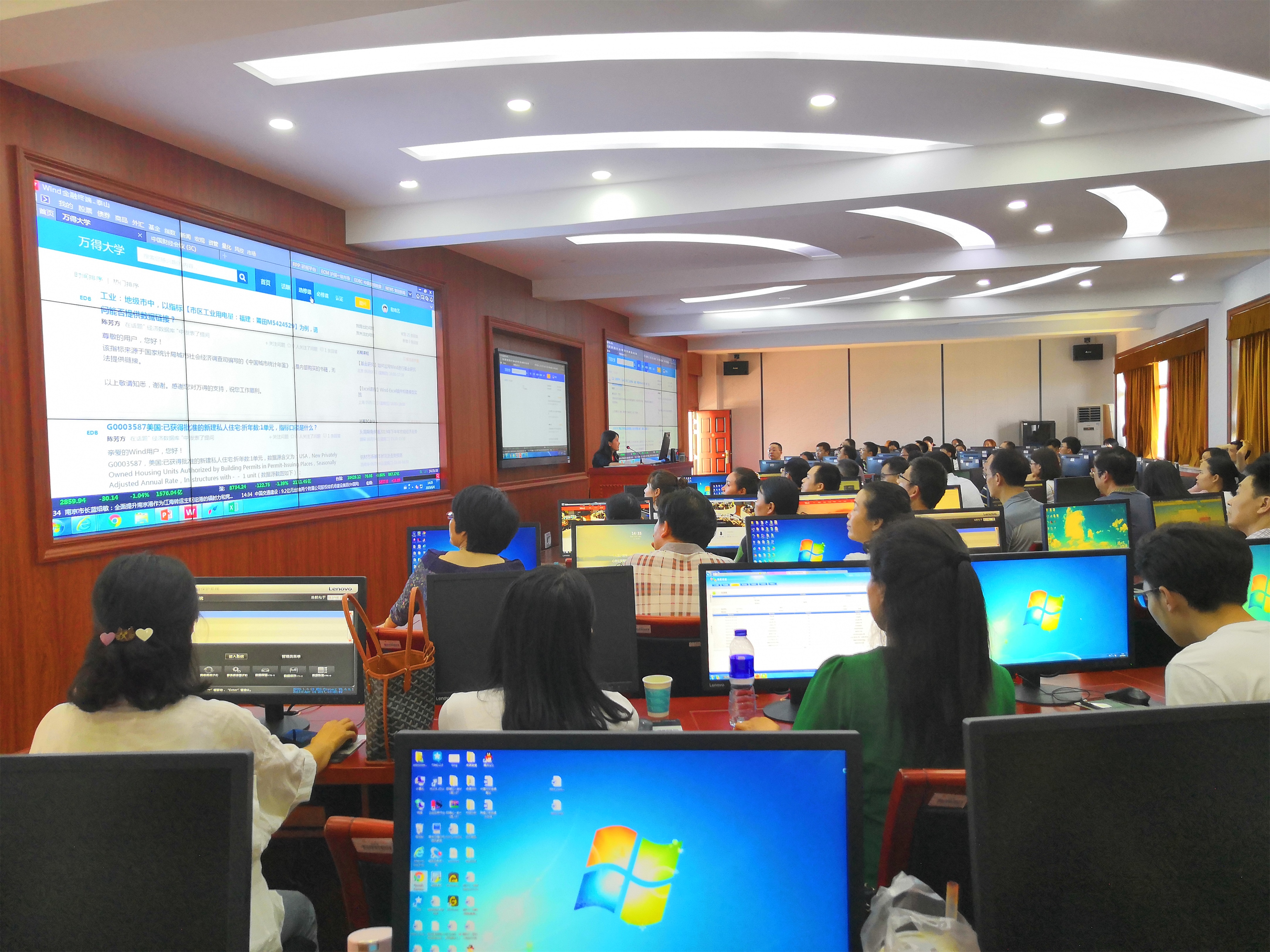 万得金融数据库软件使用培训会上,图书馆陈近副馆长对图书馆的工作以及资源服务做了简短的介绍。陈馆长主要从远程访问、超星期刊和文献传递等特色功能为大家做了简要介绍,来自万得信息技术股份有限公司的负责人为参会教师进行软件讲解与使用培训,培训会上,万得负责人为公司教师详细介绍了万得信息数据平台使用细则,通过实际操作为大家演示了万得数据库的基础功能和特色功能,包括订阅号、数据提取、宏观数据库、万能搜索框等功能板块,万得公司是中国大陆领先的金融数据、信息和软件服务企业,国内外多家金融企业经常引用万得数据库的数据。