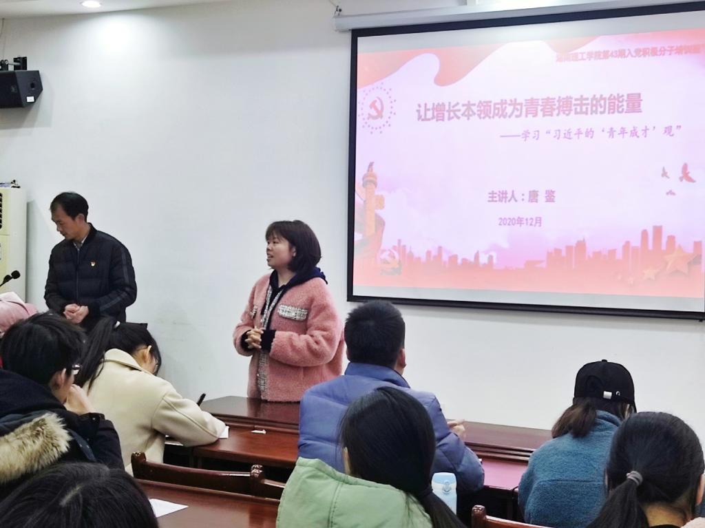 12月1日下午2:30,365best体育官网登录第43期入党积极分子培训班第四次课程《让增长本领成长为青春搏击的能量——学习“习近平的青年观”》在8301开展了。本次课程邀请到了校组织部唐鉴老师进行授课,由员工第一支部书记易振铭老师主持,第43期入党积极分子培训班全体学员共同学习。
