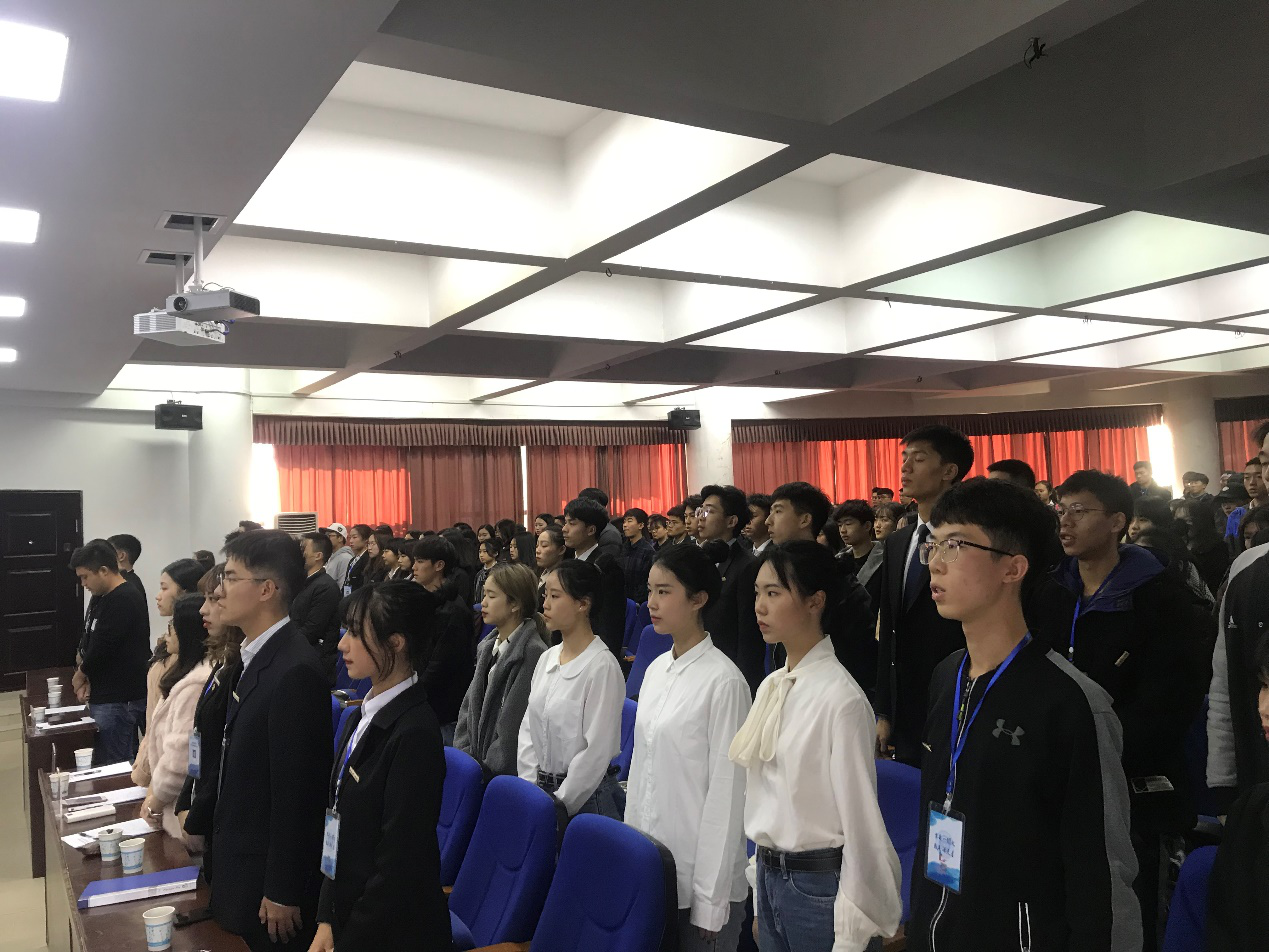在本次会议开始前,两位主持人先对今天的会议流程进行了相关的介绍。伴随着国歌声的响起,此次会议的开幕式开始,首先是由前员工会主席李雨轩学长对以前的工作进行了总结发言。在他的发言结束后,由各团长领导各个专业代表团,对接下来进行的投票以及相关事宜进行说明。