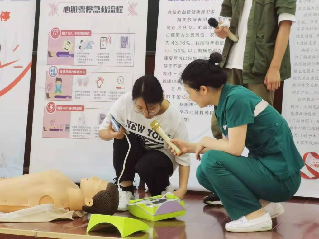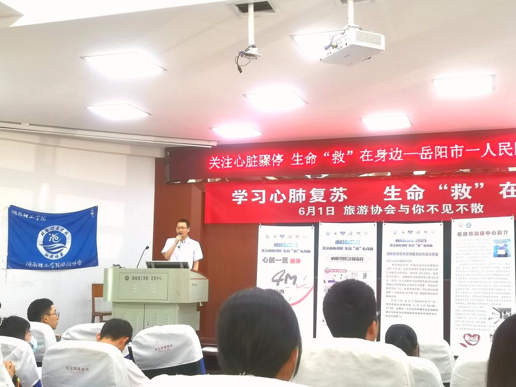 为加强同学们对突发事件的应急救治水平,更好地掌握急救知识与技能,6月1日下午,365best体育官网登录旅游协会联合岳阳市一人民医院胸痛中心专家团队,在六栋学术报告厅成功举办了以“学习心肺复苏,生命‘救’在身边”为主题的公益大讲堂。