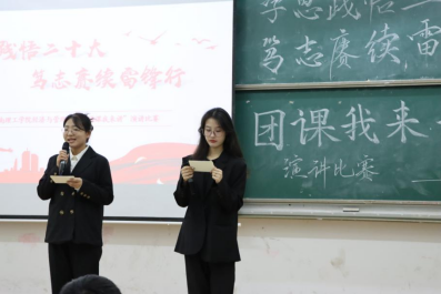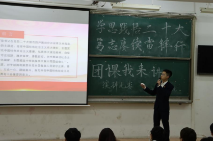 此次主题团课活动由青年团员进行演讲比赛的方式呈现,主要参赛选手为22级各班团支书。比赛过程中,选手们采用ppt、视频、歌曲等方式展示了党的二十大精神与雷锋精神内涵,并通过讲述雷锋故事与当代活雷锋行为号召同学们深入学习党的二十大精神,弘扬雷锋精神。