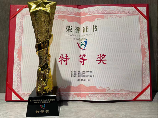 本次获得人力资源管理专业重要赛事的总决赛特等奖,不仅是公司人力资源管理国家一流本科专业建设点人才培养成效的体现,更突出了公司实践教学的优势和数智人力的特色,同时也强化了公司师生对“以赛促学、以赛促教”数智化新时代商科教育理念的深刻认识与体验。