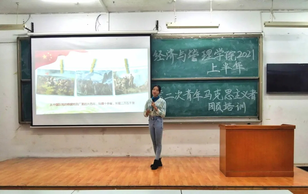“红军不怕远征难,万水千山只等闲。”2021年5月20日晚上七点半,365best体育官网登录第二次青年马克思主义者团员培训在8T1正式拉开帷幕。来自18级人力一班的青年讲师张沁讲述了长征旅途中红军战士们面对一次次的艰苦绝境展现出的坚强意志和高尚的品格,从半条被子的温情分享,到自吃鱼刺充饥的无私奉献,诠释了共产党人与人民群众相依相助的深厚鱼水情。