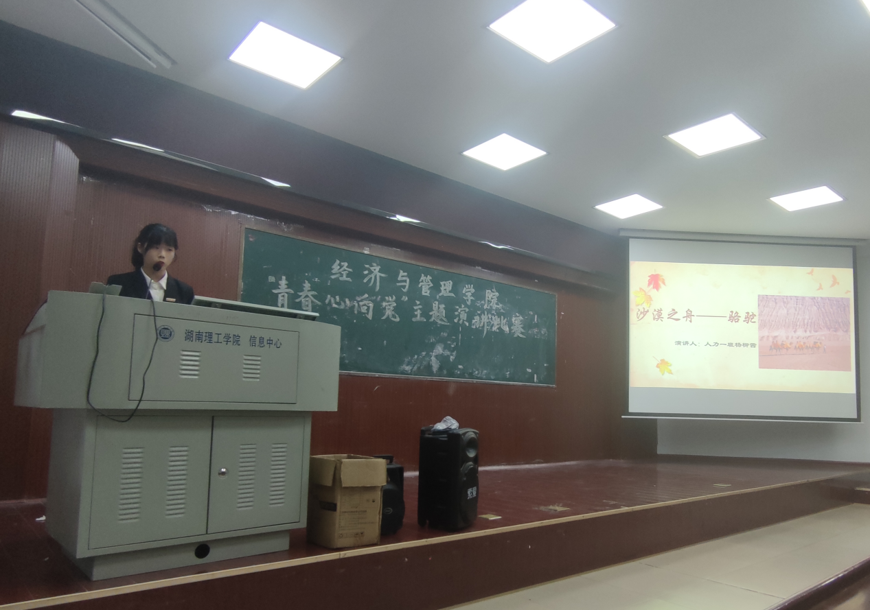 20级人力一班杨柳茜同学则以沙漠之舟“骆驼”一词引入演讲主题,娓娓讲述来自岳阳湘阴的任弼时前辈的故事,并在此基础上引入自己深度思考后的见解,呼吁大家要甘于奉献,为中华民族崛起而奋斗。