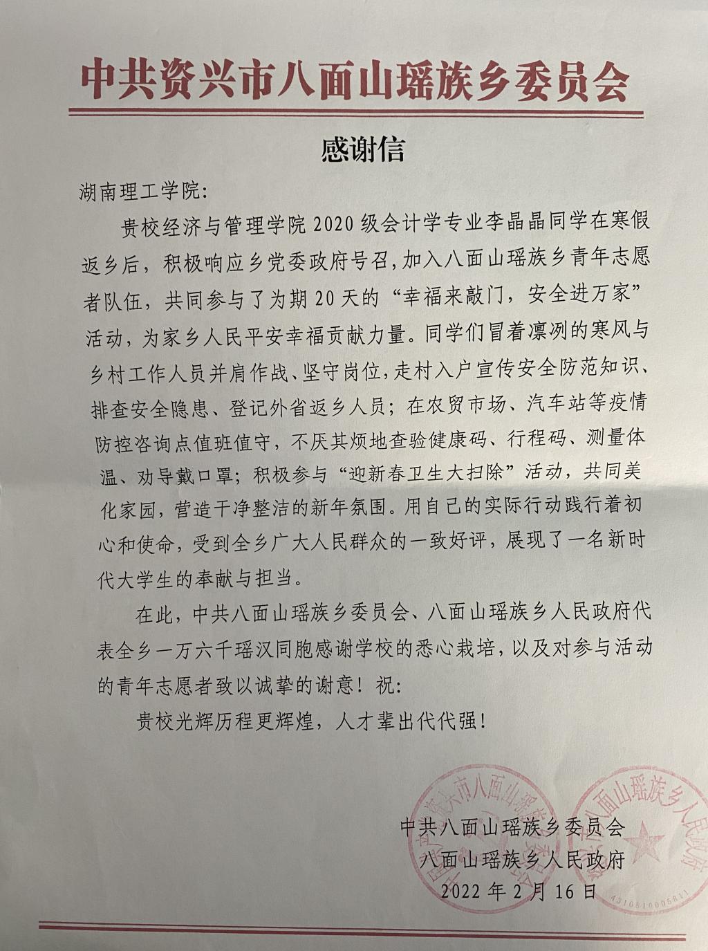 近日,365best体育官网登录收到一封来自中共资兴市八面山瑶族乡委员会的感谢信。来信详述了公司2020级会计学专业李晶晶同学在寒假返乡期间为当地疫情防控所做的努力与贡献,并对公司和员工本人表示诚挚的谢意。