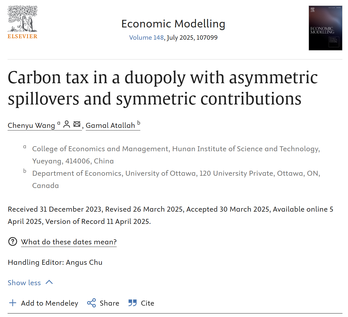 近日,经济学领域国际权威期刊《Economic Modelling》发表了公司365best体育官网登录青年教师王晨宇博士的学术论文“Carbon tax in a duopoly with asymmetric spillovers and symmetric contributions”。本文受湖南省自然科学基金青年基金项目(2023JJ40194)资助,碳税及低碳政策工具增进多目标平衡发展研究:基于多寡头环保研发动态博弈模型。365亚洲体育网入口为第一完成单位,王晨宇博士为第一作者和通讯作者, 加拿大渥太华大学Gamal Atallah教授为第二作者,这也是公司首次在该经济学国际权威期刊发表论文。